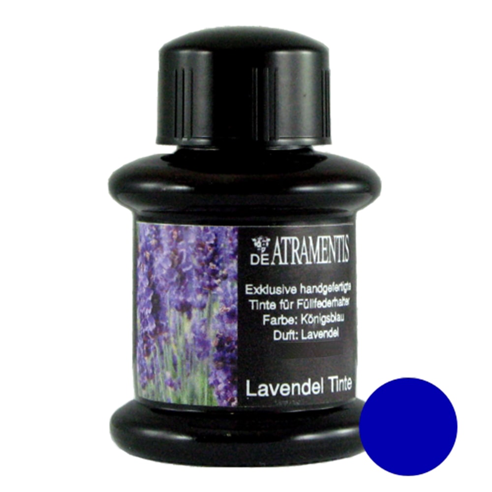 DE ATRAMENTIS Scented ink Lavender 45ml. Χειροποίητο μελάνι από την σειρά Scented με αρώματα λουλουδιών, φυτών, φρούτων κλπ. Κατάλληλο για χρήση με όλες τις πένες. Δώστε στα έγγραφα ή τις υπογραφές σας προσωπική και ξεχωριστή όψη με ένα ιδιαίτερο χρώμα. Ο Franz-Josef Jansen κατασκευάζει τα μελάνια με το χέρι όπως παλιά. Πολύ καλή χρωματική απόδοση ροή σε οποιαδήποτε πένα. Τα DE ATRAMENTIS έρχονται σε γυάλινο μπουκάλι των 45ml.