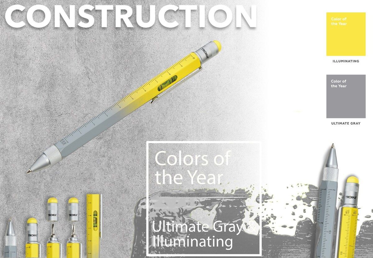 Στυλό πολλαπλών εργασιών, χάρακας εκατοστών και ίντσας, κλίμακα 1:20 m και 1:50 m, αλφάδι, κατσαβίδι με σχισμή και Phillips, γραφίδα, μαύρο ανταλλακτικό, ορείχαλκος, γκρι-κίτρινο
